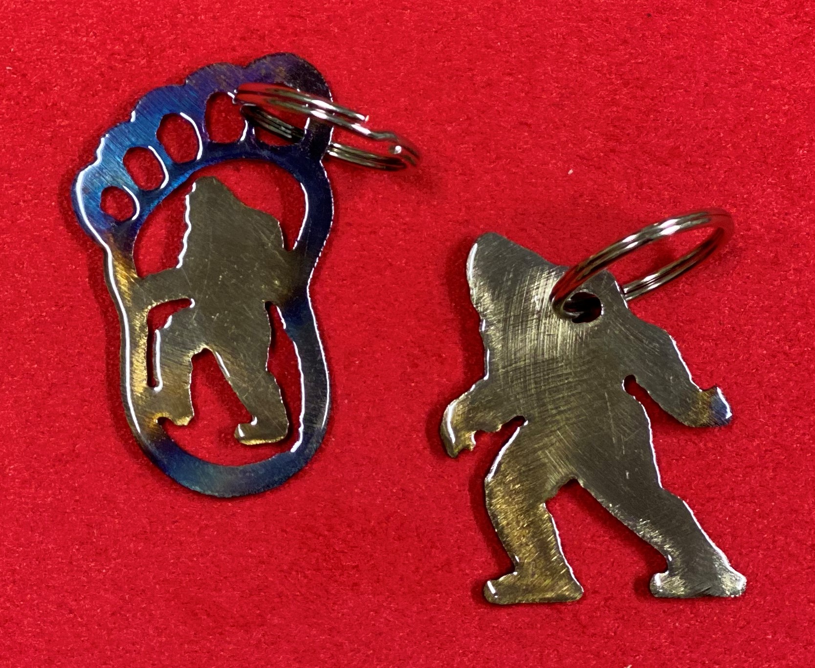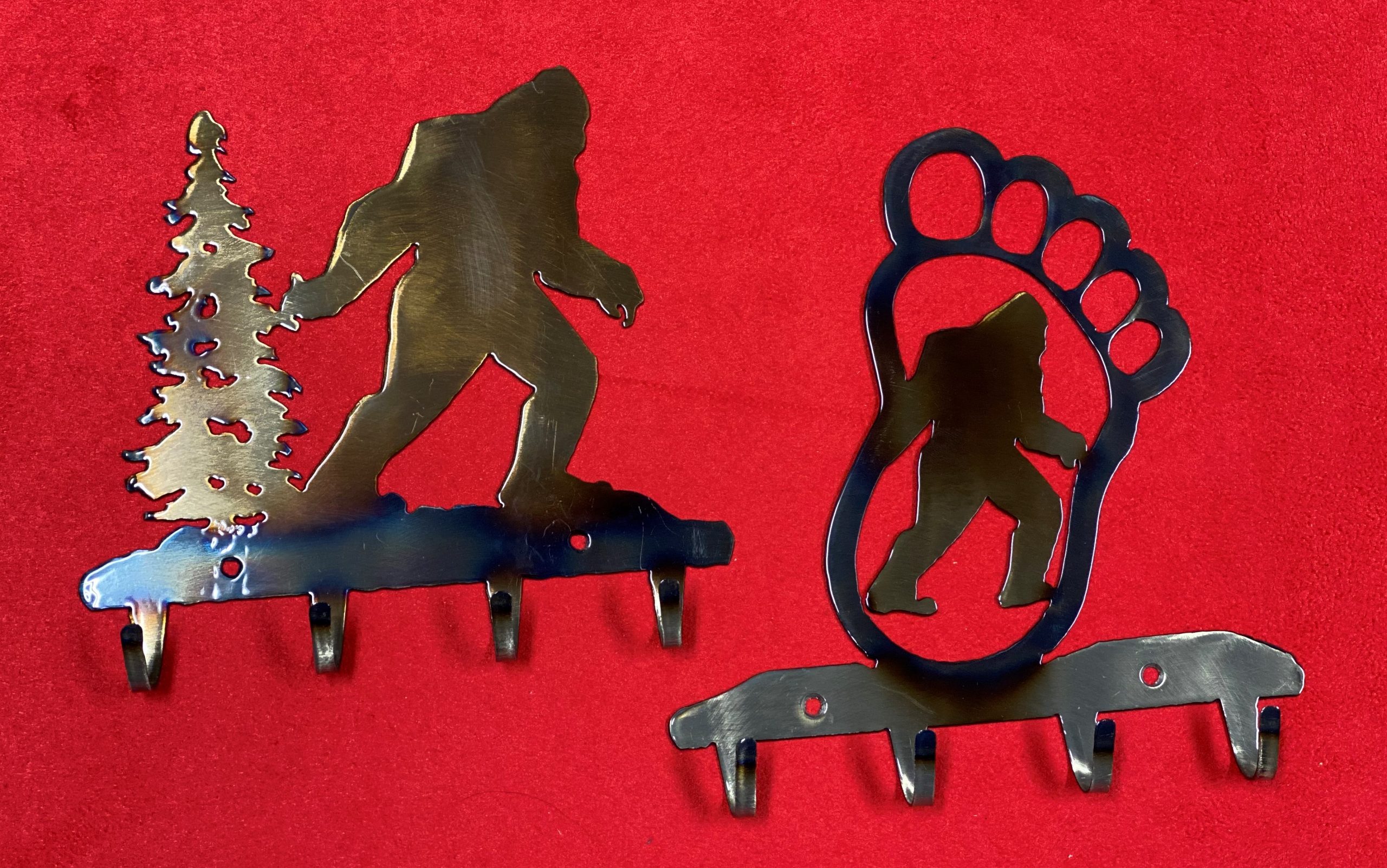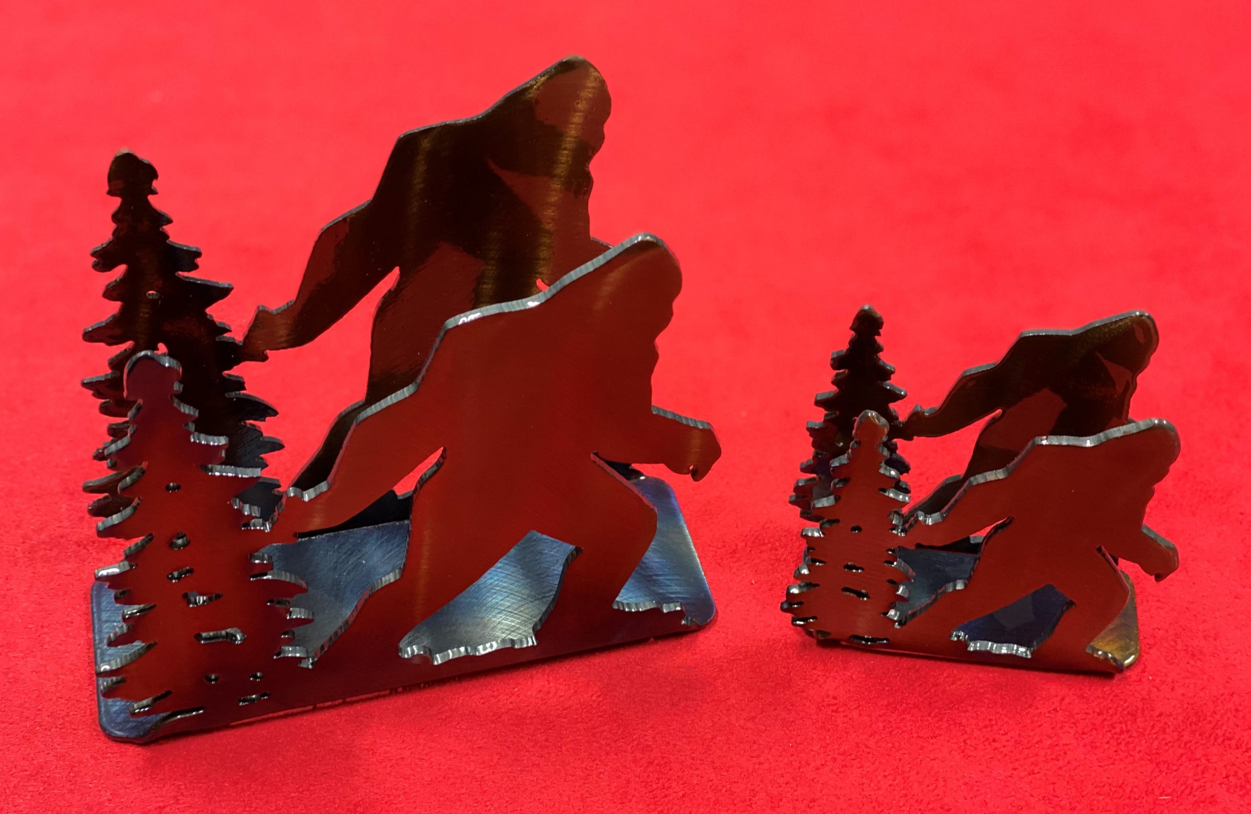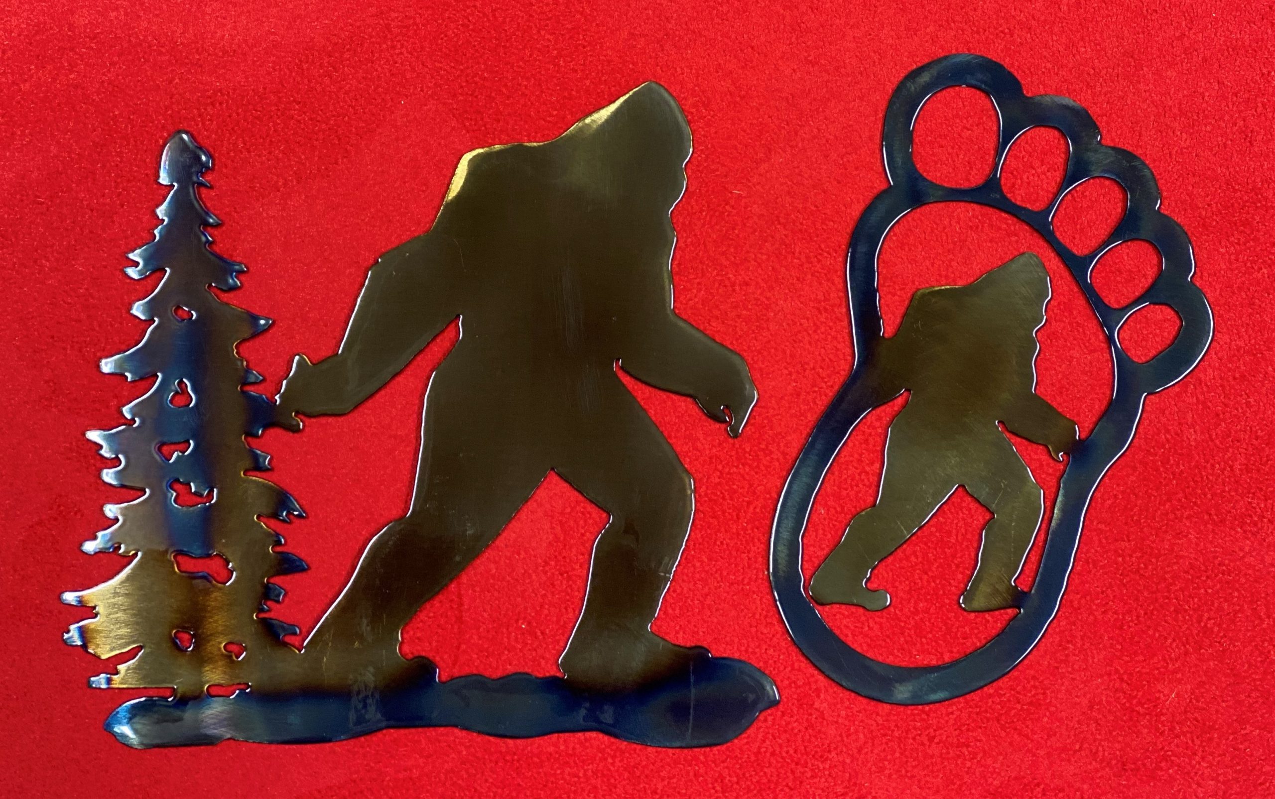 Bigfoot lives! Versatile mini-art pieces, hang on a wall, hang in a window, stick on a mirror (my favorite!). Solid metal, heat finished to give it varying colors, clear coat to protect. Buy one, or save when you buy a set of 2.